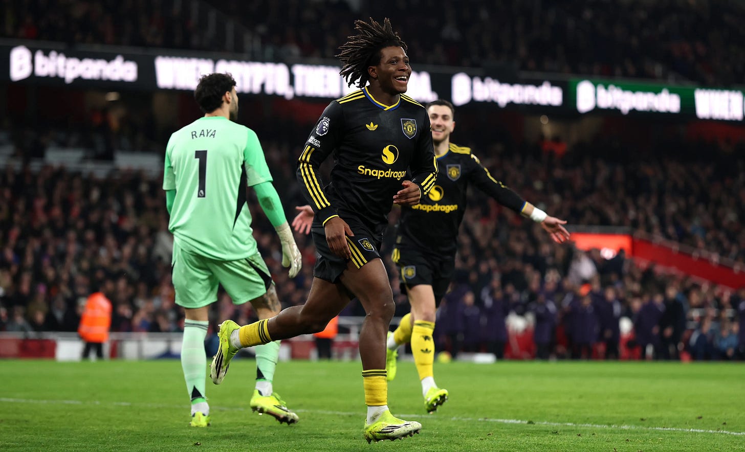 The tactical adjustments were subtle but significant. Diogo Dalot was given a strict marking job on Leandro Trossard, staying compact rather than overlapping. Luke Shaw was assigned to Saka, discipline over adventure. Dorgu, nominally a wide player, drifted inside to overload the central midfield, to give Rice and Zubimendi an extra body to worry about when they tried to play through the lines. He scored a brilliant goal and made the most defensive contributions in the game.